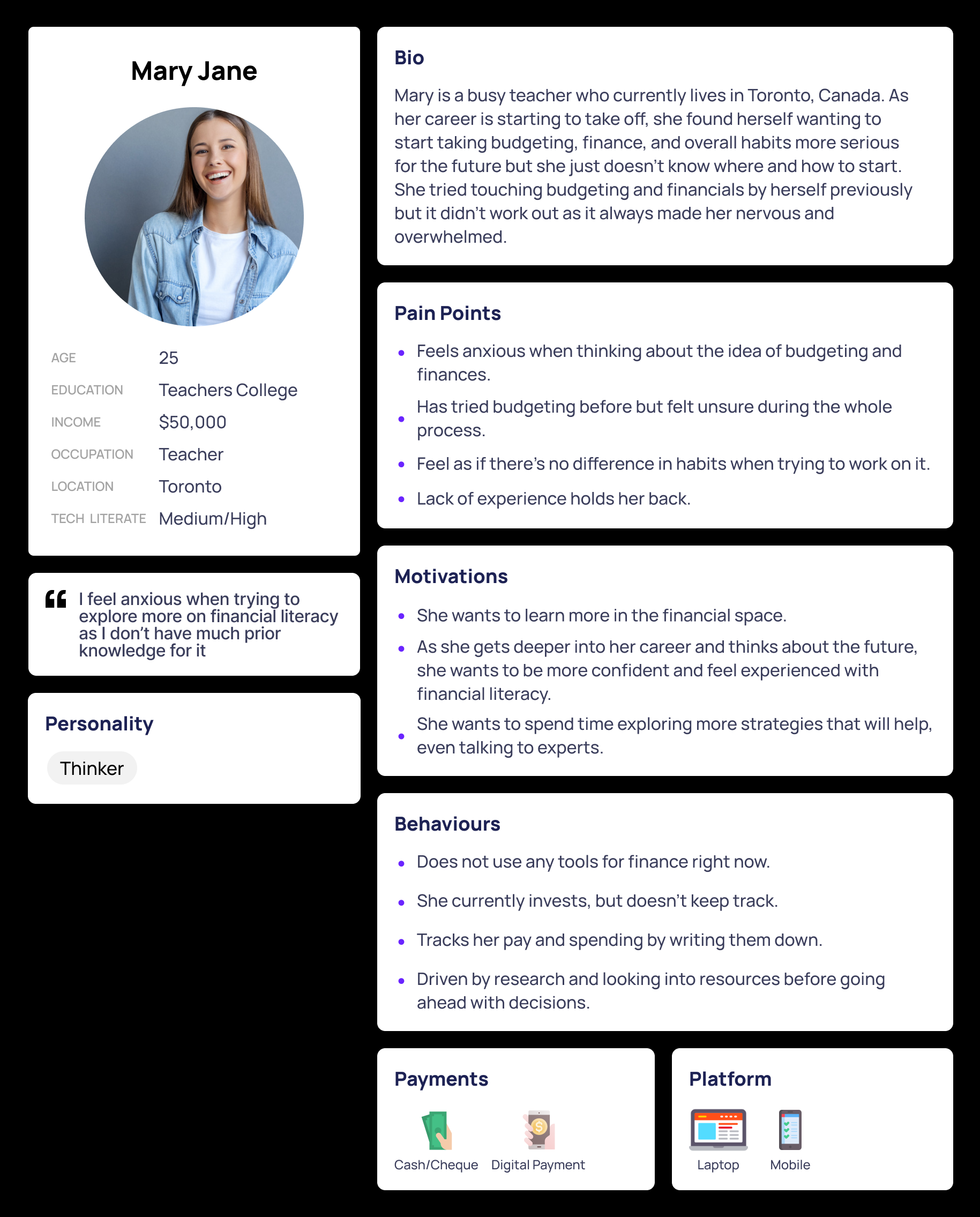 With my secondary and primary research complete, I synthesized that to create the persona which portrays my target user. Mary Jane will help guide me in design decisions as I’m focusing on a user-centric solution.