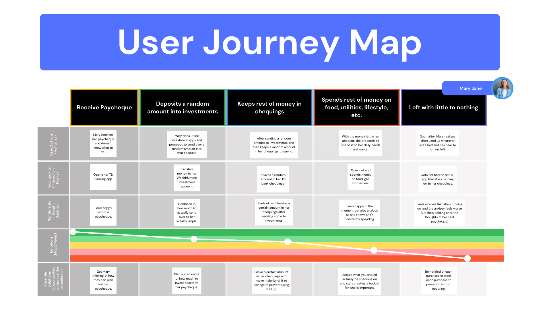 This allowed me to identify areas where design could make a meaningful impact on her financial journey.