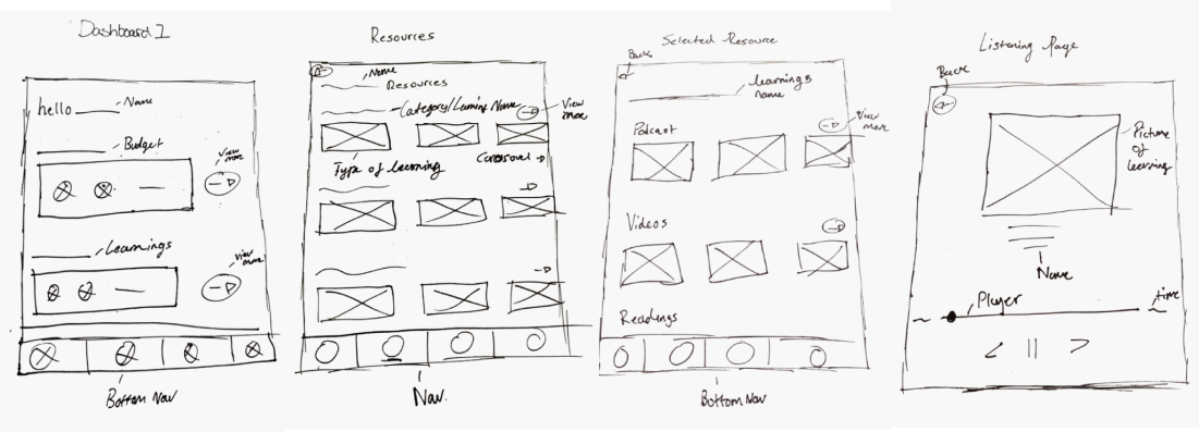 I began my preliminary sketches by referencing the primary and secondary task flows, along with a UI inspiration board I created. The board included features and functionalities from various budgeting and financial learning apps.