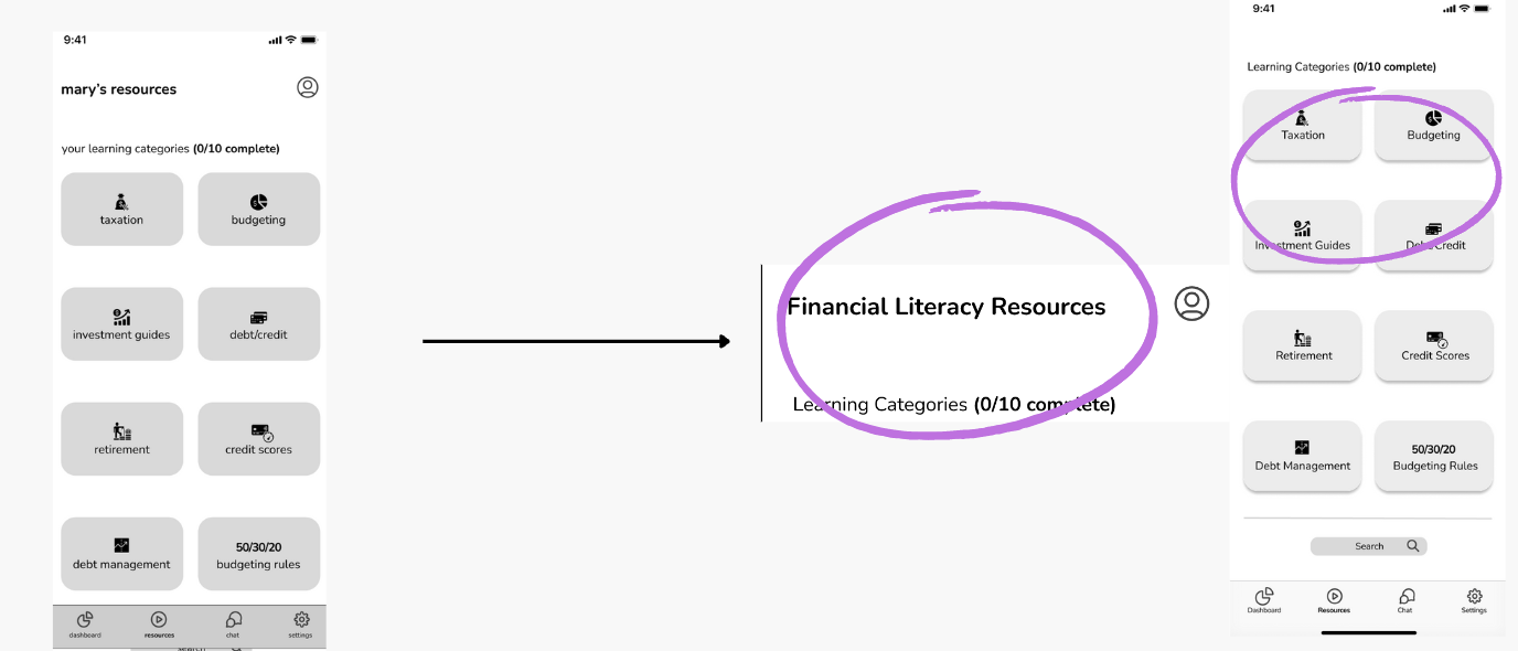 Through research and user interviews, we discovered that many users were never taught financial literacy. We gave them a tailored area for them to help them develop this.