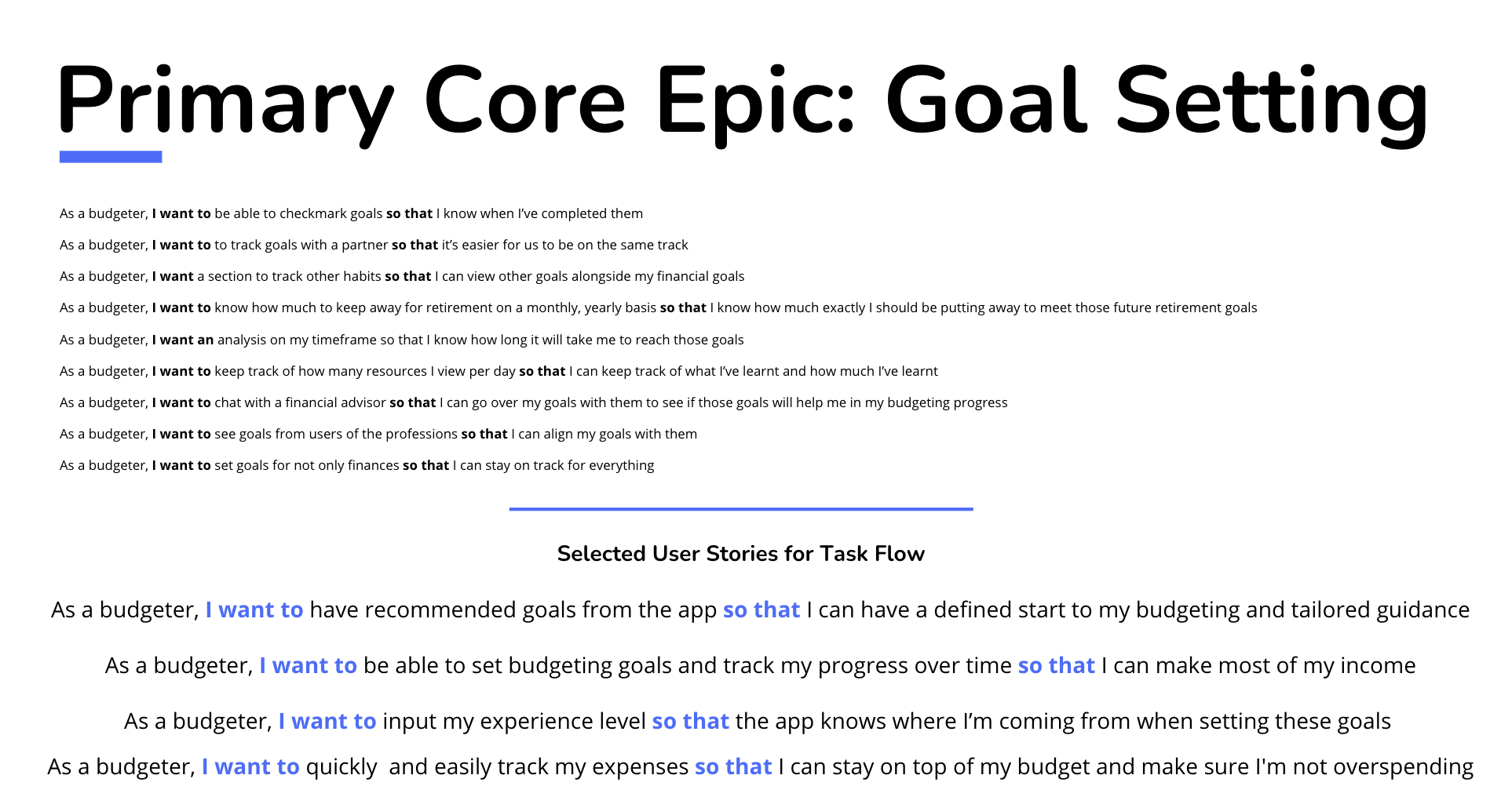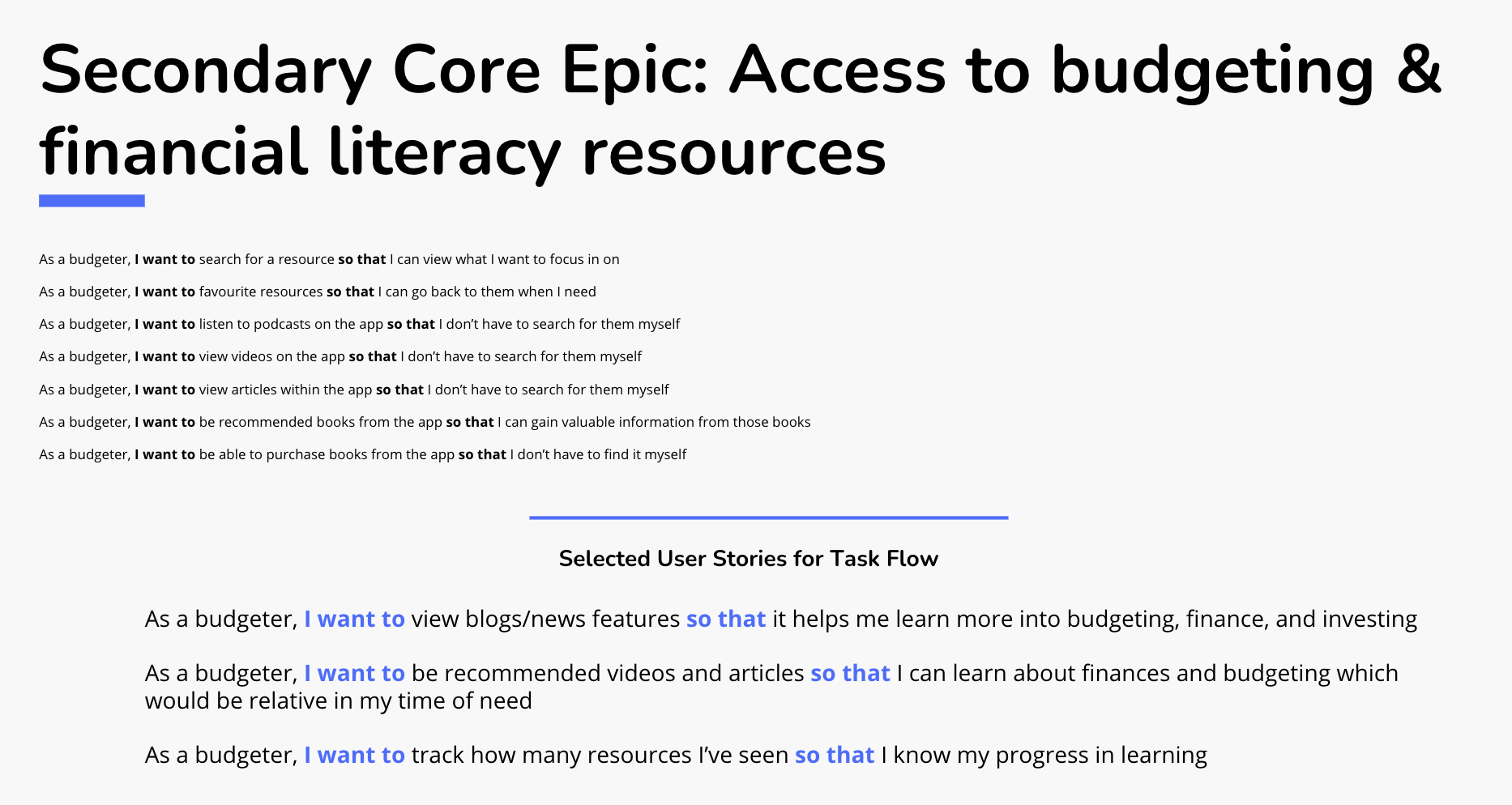 Next, I organized these user stories into epics and selected two key epics to focus on for the task flow: one as our primary core epic and the other as a secondary core epic.