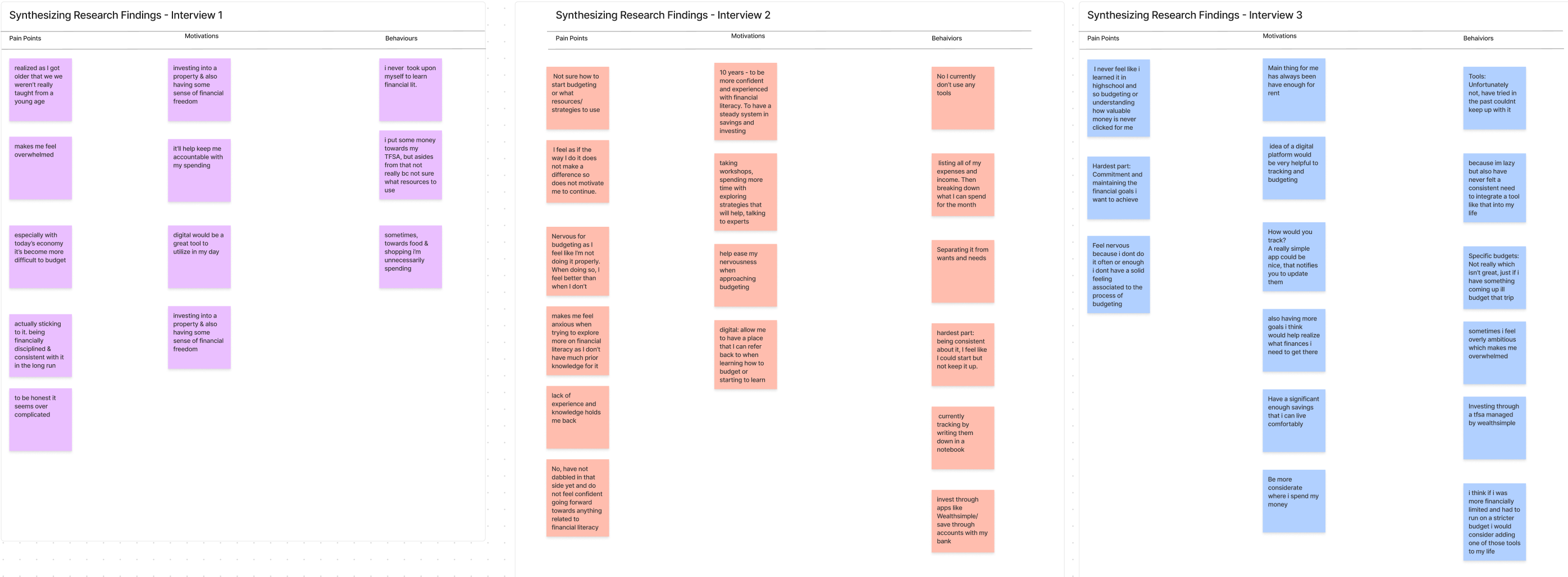 To gain a deeper understanding of the problem space, I connected with users who have little to no experience with budgeting. I conducted three 1:1 interviews and used an Affinity Map to organize the insights into key themes: motivations, behaviours, and pain points.