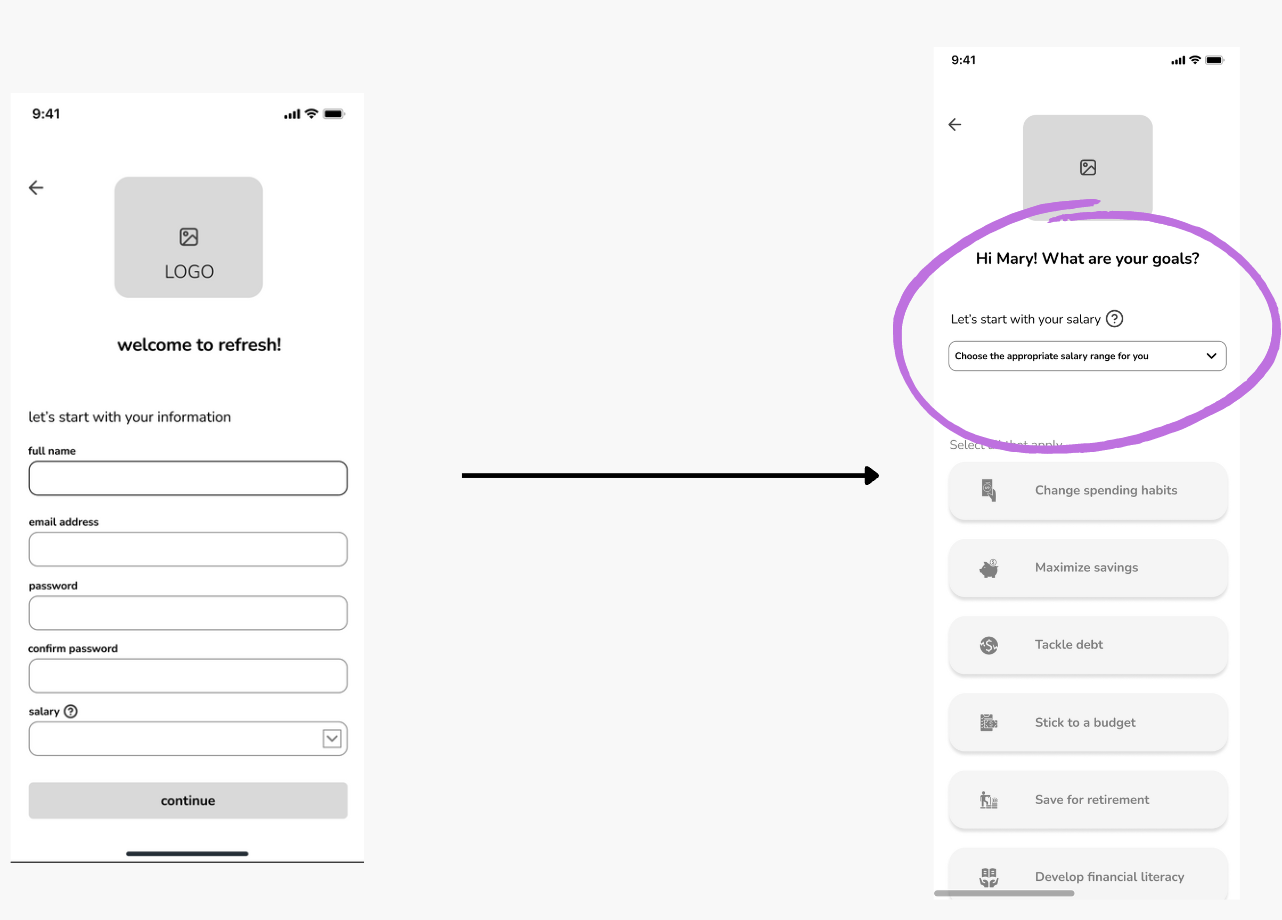 Solution: Relocate the salary input to the goals section, where it directly correlates with setting financial goals, providing users with a clearer context for its relevance.