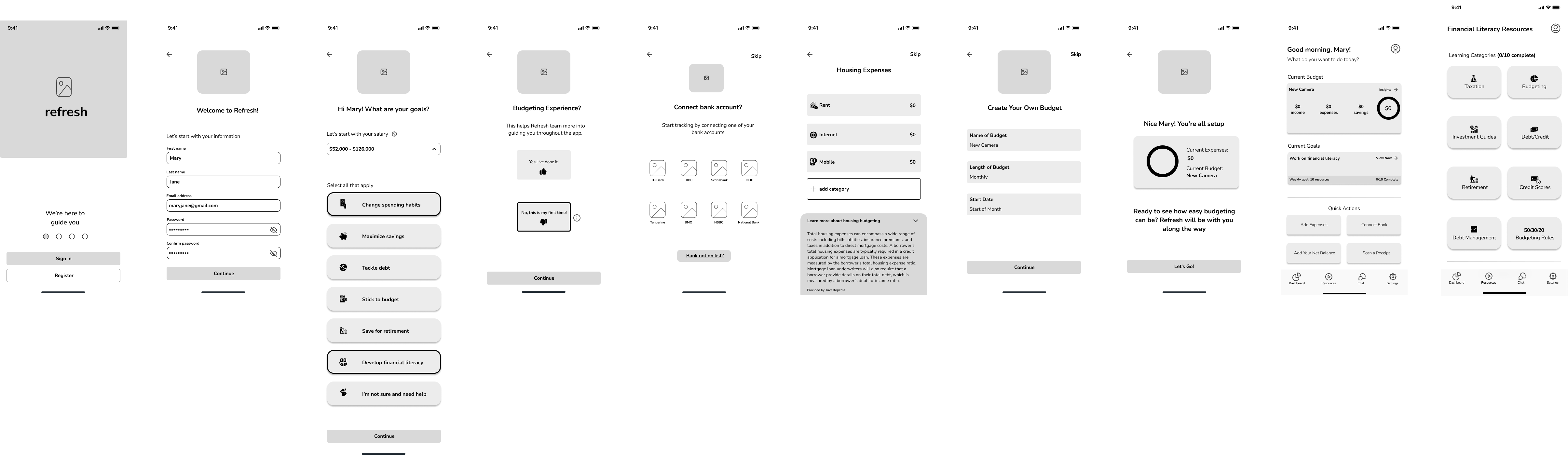 When selecting the brand name for the app, I revisited the insights from the user interviews and reflected on how they truly felt about budgeting. I wanted the name to embody the adjectives that represent the app’s calming and welcoming nature. Ultimately, I chose the name Refresh, as it symbolizes a fresh start for users with their finances and financial literacy. This name aligns with the app’s purpose and resonates with users who are looking to take control of their financial journey.